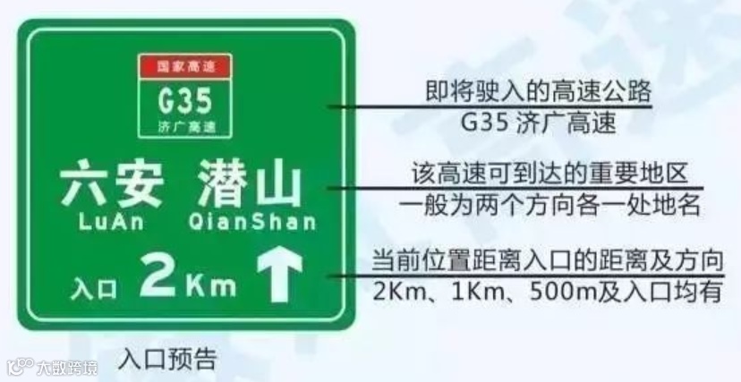 普通公路或市政道路临近高速公路的位置会有如下图所示的高速公路入口标志牌,包括提示驾驶人前方高速公路名称、行驶方向及该条高速禁止或限制车辆、驾驶人某种交通行为的标志牌。