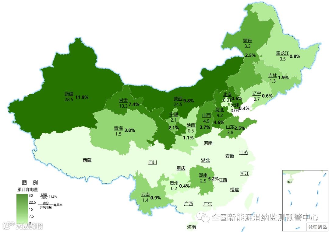 截至6月底各地区累计弃风电量(亿千瓦时)及弃风率