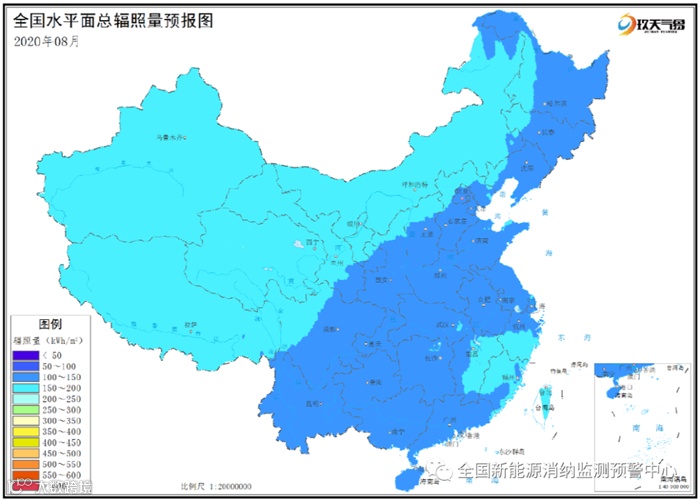 全国大部分地区风速和水平面总辐射随月份呈减小趋势。根据中国气象局预测,风能资源方面,三季度随着月份递增风速呈减小趋势,全国大部地区风速在3.5m/s~6m/s之间,7月、8月东北大部、华北东南部、黄淮中东部、江淮大部、华南地区东部等地平均风速为4.0m/s~6.0m/s,华北北部(内蒙古)、西北地区大部、西南地区中西部、华南地区南部及沿海地区风速超过6.0m/s,部分地区平均风速超过7.0m/s,9月大部地区风速呈减小趋势,内蒙古东部、东北地区、华南东部沿海风速呈增加趋势;太阳能资源方面,随着月份的增加,各地的水平面总辐射月总量均呈减小趋势,相比8月份,9月份各地的水平面总辐射的减小程度更为明显,平均水平面总辐照量与常年同期相比,全国大部地区与常年同期相当。