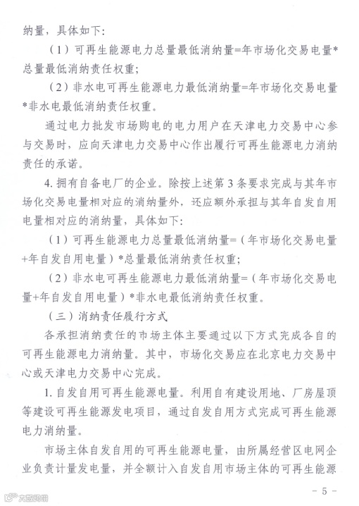国网天津市电力公司、各类售电公司、通过电力市场购电的电力用户以及拥有自备电厂的企业的电力消纳责任权重为:总量最低消纳责任权重14.5%,非水电最低消纳责任权重14.0%。