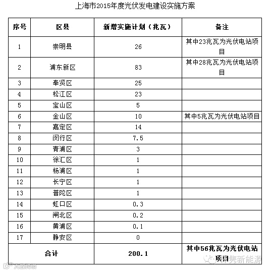 一、关于规模指标。根据国家有关文件精神,2015年上海市在不发生弃光的前提下,不设光伏发电建设规模上限。在综合考虑各区(县)资源条件、发展基础等因素基础上,结合各区(县)上报的年度实施方案,本市2015年度光伏发电建设实施方案为新增200.1兆瓦,其中光伏电站56兆瓦、分布式光伏发电144.1兆瓦。