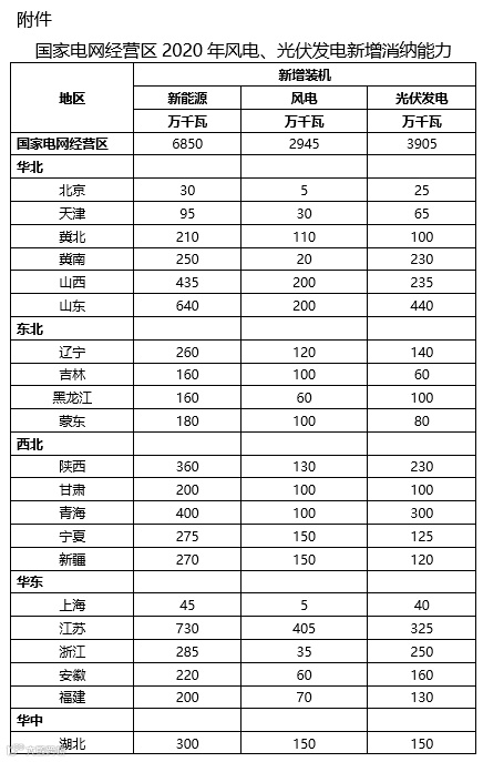 为深入贯彻落实中央关于统筹推进疫情防控和经济社会发展的决策部署,综合考虑前期电力负荷受新冠肺炎疫情影响低位运行导致新能源消纳困难等不可抗力因素,国家能源局明确2020年一季度风电、光伏发电的限发电量不纳入清洁能源消纳统计考核。在完成《清洁能源消纳行动计划(2018-2020年)》确定的重点地区风电、光伏发电利用率目标前提下,充分释放新能源消纳能力,按剔除一季度限发电量情形测算,国家电网经营区2020年风电、光伏发电合计新增消纳能力6850万千瓦,其中风电2945万千瓦、光伏3905万千瓦。国家电网经营区2020年各省(区、市)风电、光伏发电新增消纳能力情况详见附件。