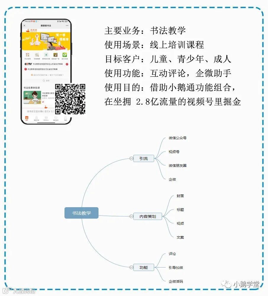 通过在官方视频号矩阵发布书法教学短视频,并在每条视频下方附上推文链接,将用户引流到个人微信进行针对性服务,极大地拓宽了流量来源。