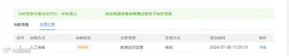 变更保存后,可在教育经历表格上方,当前信息的右侧,点击变更记录查看已提交的教育经历变更记录。信息包括审核方式、审核状态、变更类型、变更方式以及提交时间。点击详情可以查看详细信息,并且变更信息会标红显示。