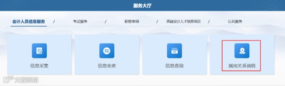 1..登录成功后,点击首页的会计人员属地关系调转进入到会计人员信息调转页面,或者会计人员信息服务下的属地关系调转。