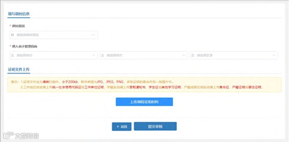 提交调转申请必须要上传调转证明材料,工作岗位变动请上传统一社会信用代码证或工作单位证明,学籍变动请上传录取通知书、学生证或其他学习证明,户籍或居住地变动请上传身份证、户籍证明或居住证明。信息填写完成并上传完证明材料后提交审核。