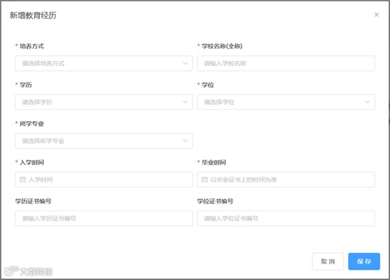 7.在教育经历页中,点击新增进行教育经历的信息采集。新增教育经历弹窗包括培养方式、学校名称、学历、学位(填写已取得证书的学历、学位)、所学专业、入学时间、毕业时间、学历证书编号、学位证书编号以及根据所填信息上传必要的附件。