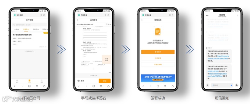 1、培训机构批量发起签约后,可短信推送给学员家长,家长可通过手机验证来核验身份,选择手写或签名即可完成签署。签署完成后,短信自动通知学员家长。