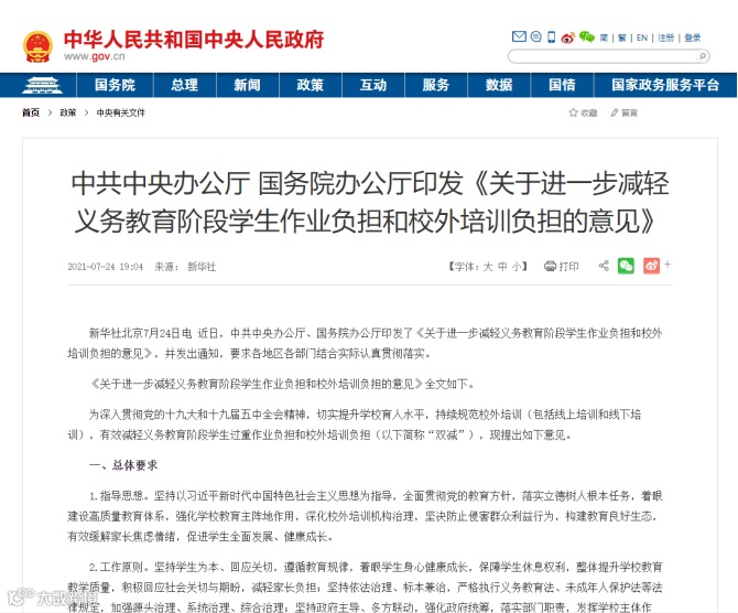 2021年7月,“双减”政策落地。为持续规范校外培训(包括线上培训和线下培训),有效减轻义务教育阶段学生过重作业负担和校外培训负担,中共中央办公厅、国务院办公厅印发《关于进一步减轻义务教育阶段学生作业负担和校外培训负担的意见》,提出从严治理,全面规范校外培训行为。