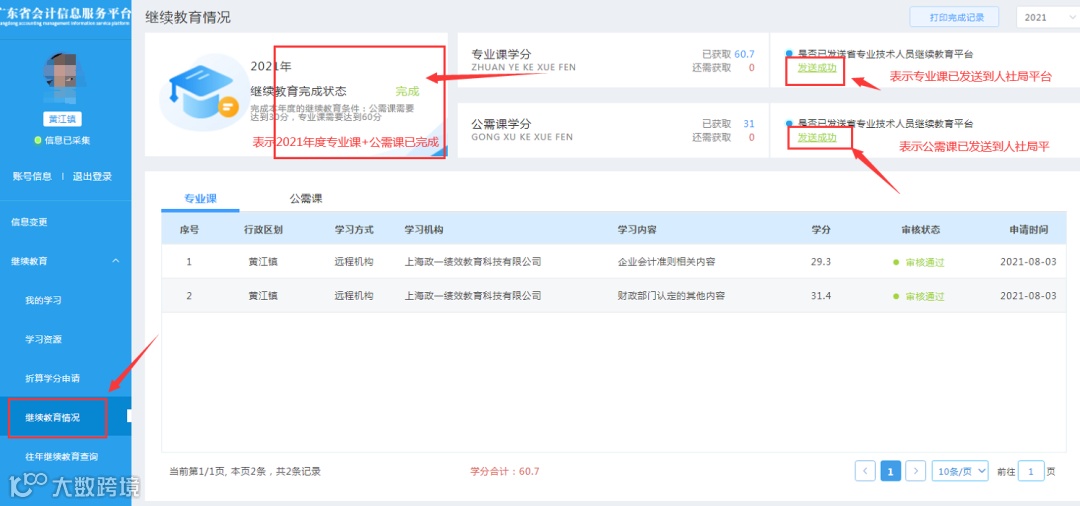 登录后点击继续教育-我的学习-当年继续教育查询,政策要求专业课需要达到60分,公需课需要达到30分。如果显示2021年已报名已完成,说明今年的会计继续教育已经完成,如图: