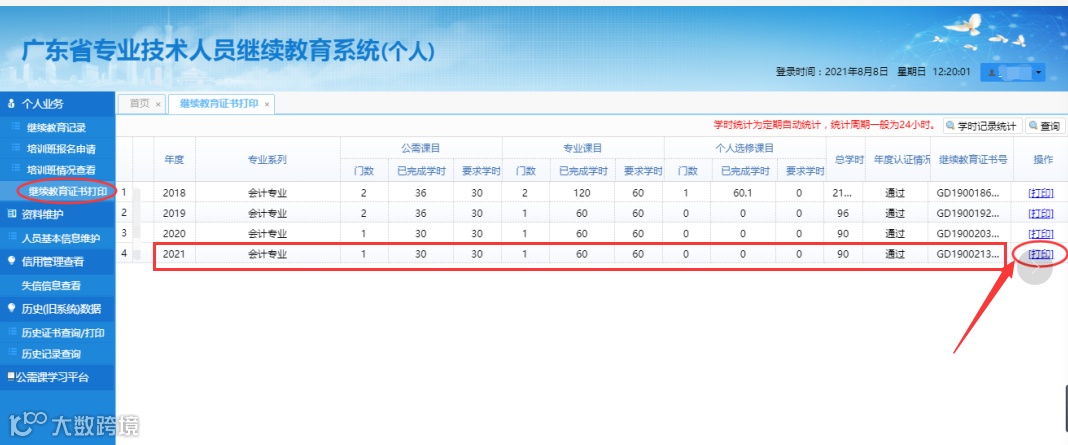 输入个人账号、密码、验证码,点击个人登录。登录后如下图点击个人业务-继续教育证书打印-打印(需要纸质可打印,无需纸质可点击打印查看)