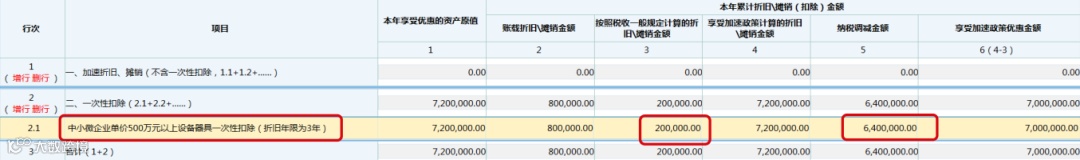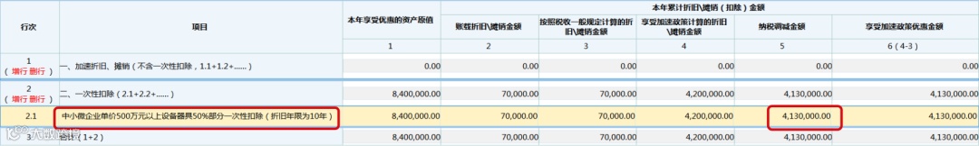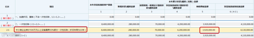 一次性扣除项目下拉菜单选择“中小微企业单价500万元以上设备器具50%部分一次性扣除(折旧年限为10年)”;