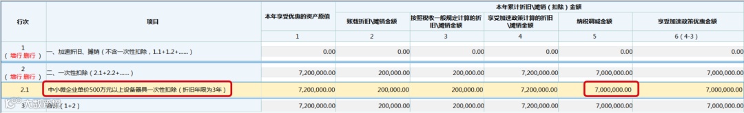 一次性扣除项目下拉菜单选择“中小微企业单价500万元以上设备器具一次性扣除(折旧年限为3年)”;
