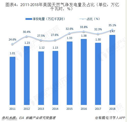 图表4:2011-2018年美国天然气净发电量及占比(单位:万亿千瓦时,%)