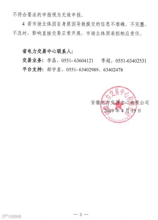 安徽电力交易中心日前发布了《关于开展安徽省2019年5月份电力集中直接交易的市场公告》,本次交易申报价格不得高于384.4元/兆瓦时,2019年4月23日各市场主体通过电力交易平台申报交易意向电量和电价。