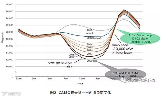间歇性可再生能源的大量渗透,尤其是太阳能,对加州的电力系统带来了很大的挑战。下图是加州批发电力市场运营系统CAISO从2012年到2020年实际和预测的在某一日的净负荷变化。由于太阳能在白天的出力迅速增加,在中午12时~下午3时系统的净负荷变得很低,这时系统面临非常大的出力过多风险。但在下午3时~7时左右,因为太阳能的出力迅速降低,系统净负荷迅速增长,系统又面临没有足够的资源来满足出力增长的需求。净负荷在一天之内这样大幅度变化充分说明加州需要有非常灵活的资源来及时的应对风电和太阳能带来的变化。