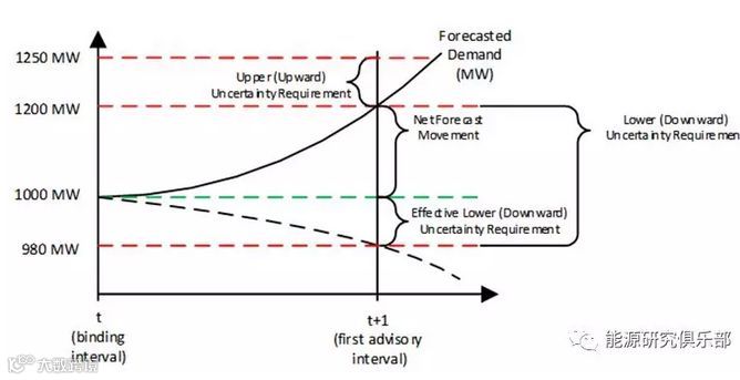 2016年,CAISO在其15分钟和5分钟的实时市场引入了一种新的辅助服务产品“灵活爬坡产品”(FRP)。灵活爬坡产品FRP用来应对系统净负荷(原负荷减去风力发电量减去太阳能发电量)变化的两个原因:预期的净负荷变化和预期之外不确定性的净负荷变化。和传统的辅助服务产品不同,这种产品的需求和规格不是根据系统某一个时刻的状态而定,而是依据两个时间点的变化而定。例如,下图所示的净负荷在时间点t和t+1预期变化为200 兆瓦(从1000兆瓦到1200兆瓦),向上变化不确定性需求为50兆瓦(从1200兆瓦到1250兆瓦)。该时间间隔的向下总不确定性需求为220兆瓦(从1200兆瓦到980兆瓦),但因为预期净负荷变化为200兆瓦,因此,实际向下变化不确定性需求为20兆瓦(220兆瓦减去200兆瓦)⁹。