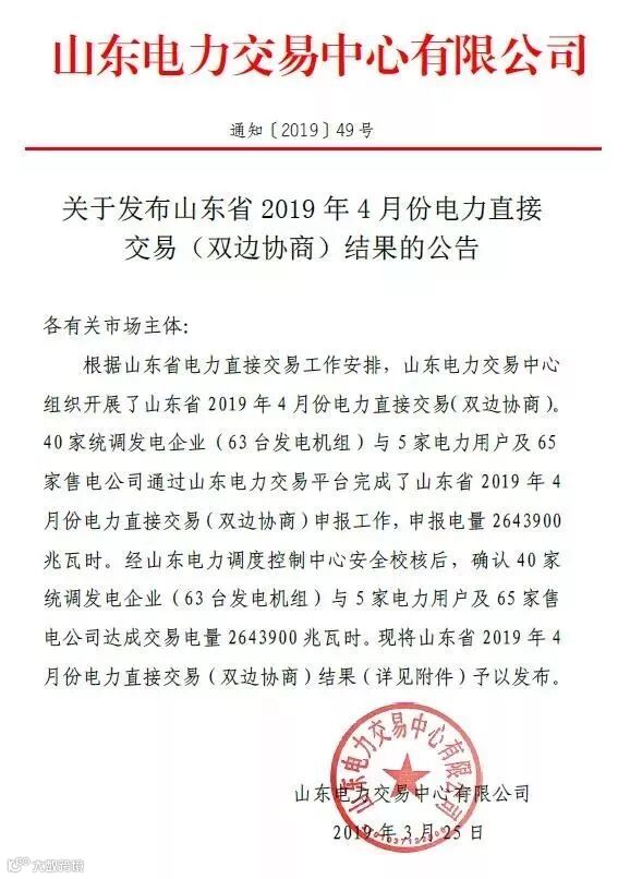 导读:根据山东省电力直接交易工作安排,山东电力交易中心组织开展了山东省2019年4月份电力直接交易(双边协商)。
