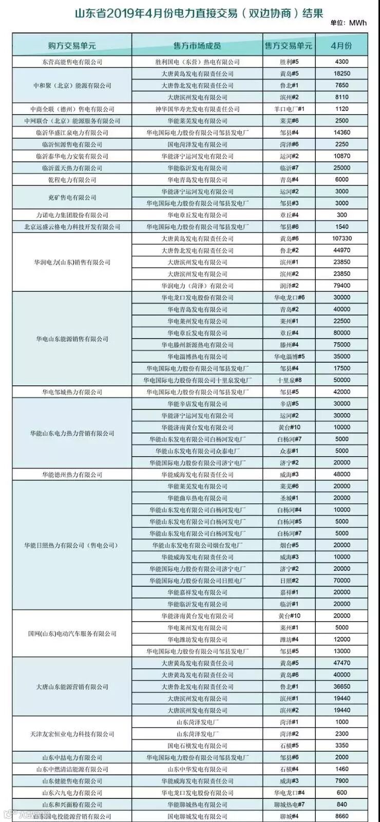 山东省2019年4月份电力双边协商交易结果:交易电量2643900兆瓦时