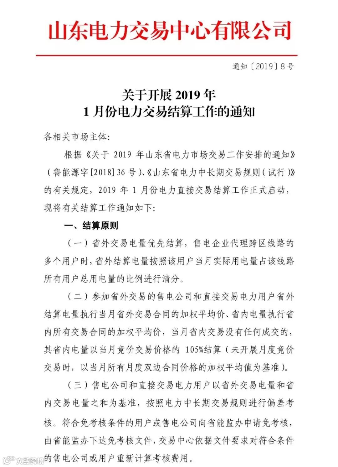 山东电力交易中心今日发布了《关于开展2019年1月份电力交易结算工作的通知》,省外交易电量优先结算;参加省外交易的售电公司和直接交易电力用户省外结算电量执行当月省外交易合同的加权平均价、省内电量执行省内所有交易合同的加权平均价,当月省内交易没有任何成交的,其省内电量以当月竞价交易价格的105%结算;售电公司和直接交易电力用户以省外交易电量和省内交易电量之和为基准,按照电力中长期交易规则进行偏差考核。