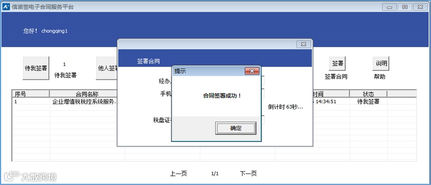 在税盘证书口令一栏输入金税盘的证书口令(8位),勾选阅读并同意,进入到下一步,页面显示待我签署的合同: