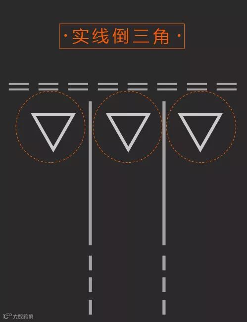 这种倒三角图案通常出现在两条白色虚线前方,也是一种减速标记,主要是提示驾驶人让主干道和行人先行。如果在设有这种标记的路口,主路车辆与主干道车辆发生事故,辅路车辆负主要责任;若在斑马线前不主动避让行人,也将被罚款、记分。