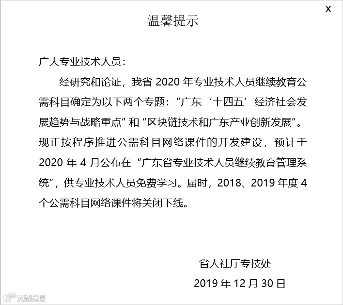 经研究和论证,我省2020年专业技术人员继续教育公需科目确定为以下两个专题:“广东‘十四五’经济社会发展趋势与战略重点”和“区块链技术和广东产业创新发展”。现正按程序推进公需科目网络课件的开发建设,预计于2020年4月公布在“广东省专业技术人员继续教育管理系统”,供专业技术人员免费学习。届时,2018、2019年度4个公需科目网络课件将关闭下线。
