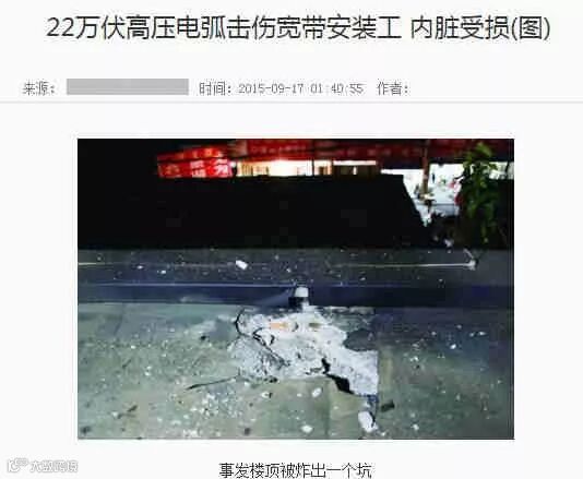 2015年,某市某批发市场南侧,一网络安装公司工人在3层门面房屋顶上装宽带时,被旁边220千伏高压线电弧放电击伤,屋顶被炸出澡盆大小的坑。