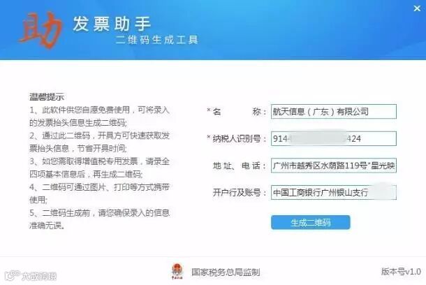 【第四步】 点击“生成二维码”。软件会自动将填写的开票信息生成二维码,可保存或打印,如下图: