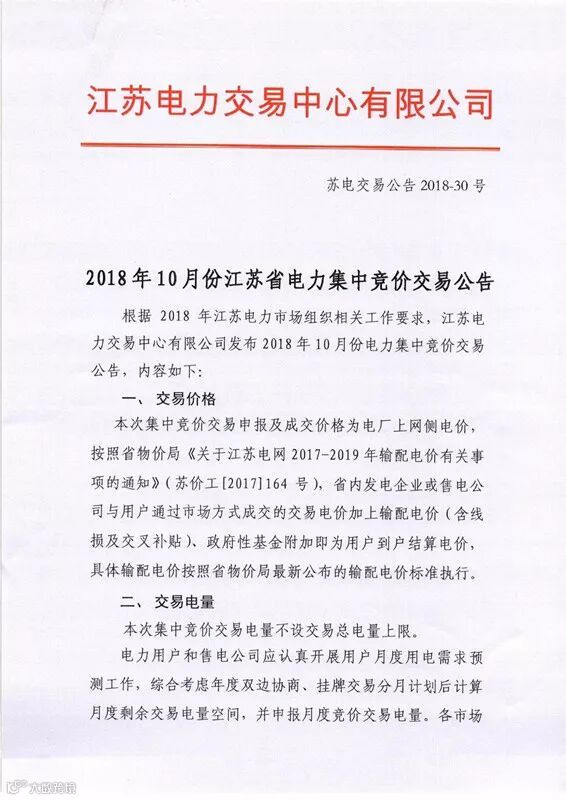 导读:江苏电力交易中心日前发布了《2018年10月份江苏省电力集中竞价交易公告》,本次集中竞价交易电量不设交易总电