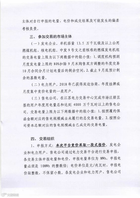 江苏2018年10月电力集中竞价交易:不设交易总电量上限但市场主体需承担偏差考核责任
