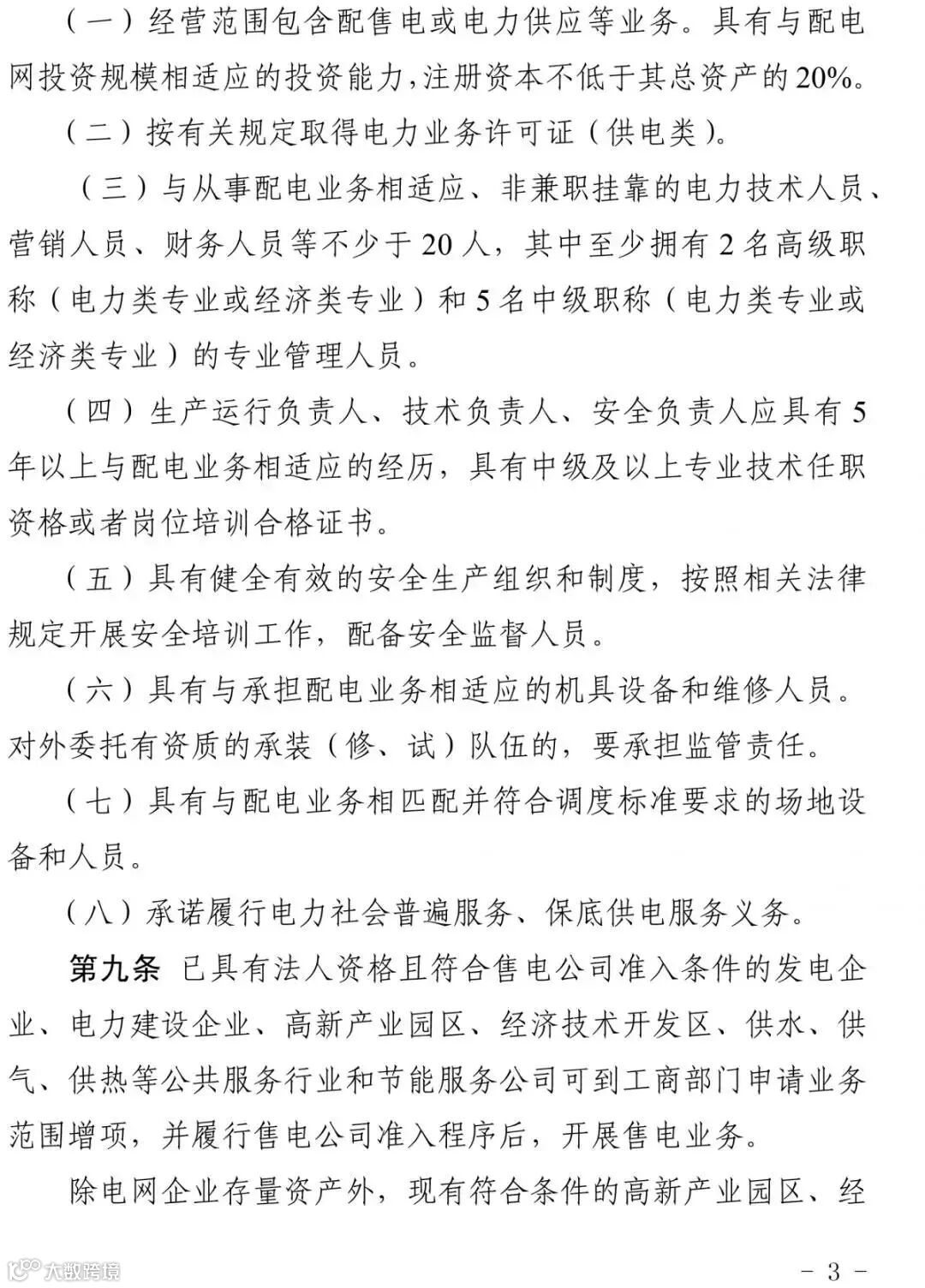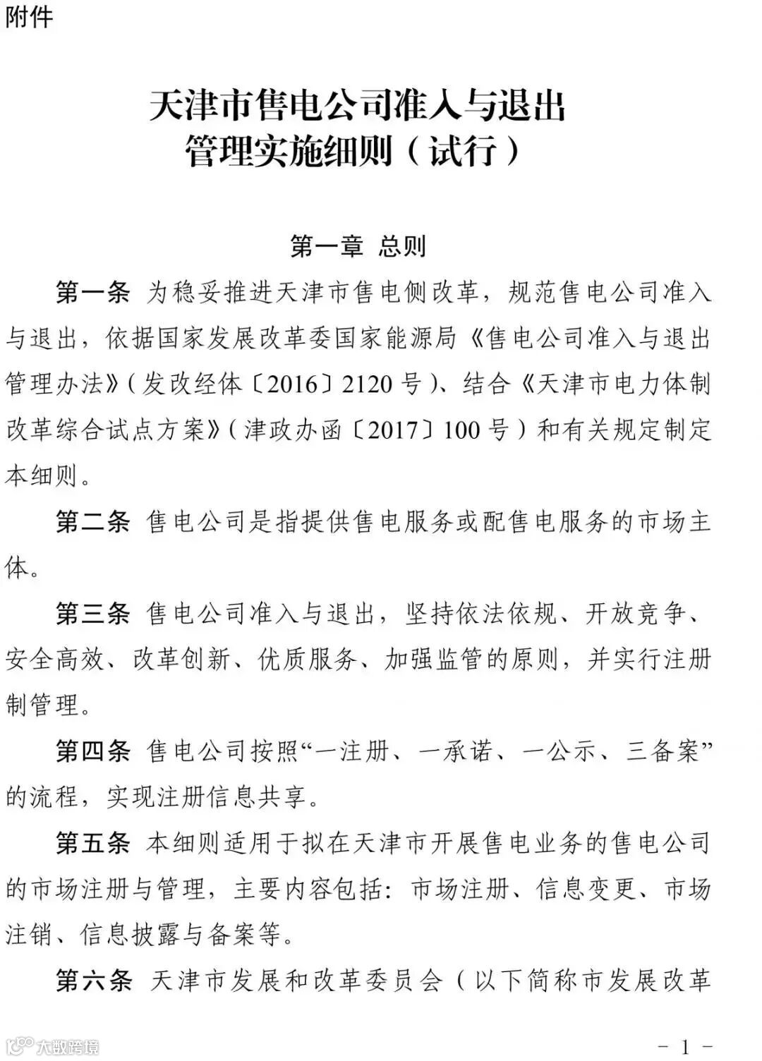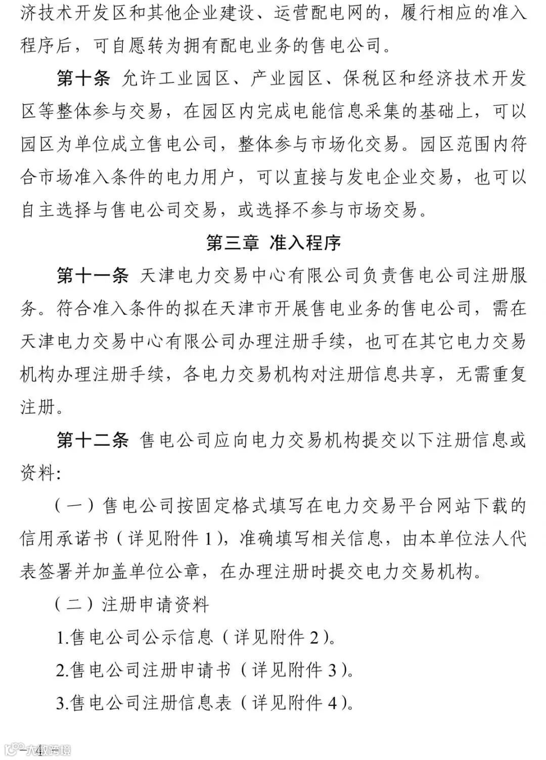 天津电力交易中心获悉,天津市发改委、天津市工经信委近日联合印发了《天津市售电公司准入与退出管理实施细则(试行)》,除电网企业存量资产外,现有符合条件的高新产业园区,经济技术开发区和其他企业建设、运营配电网的,履行相应的准入程序后,可自愿转为拥有配电业务的售电公司。