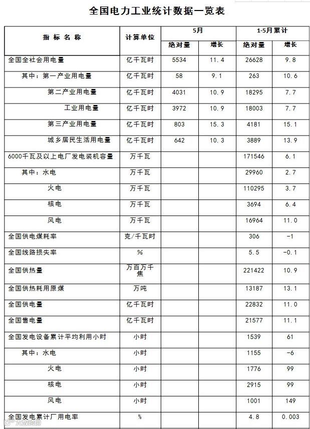 导读:6月20日,国家能源局发布1-5月份全国电力工业统计数据。