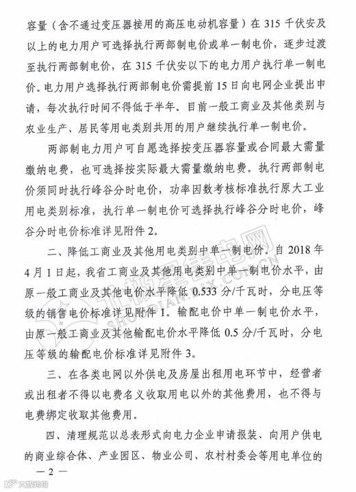 河南省发改委日前发布了关于2018年电价调整有关事项的通知,通知提出,自2018年4月1日起,河南省工商业及其他用电类别中单一制电价水平,由原一般工商业及其他电价水平降低0.533分/千瓦时;输配电价中单一制电价水平,由原一般工商业及其他输配电价水平降低0.5分/千瓦时,分电压等级的具体情况详见附件。