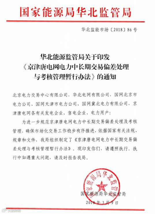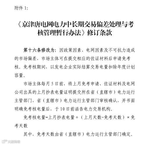 北京电力交易中心日前发布了关于征求《京津唐电力中长期交易偏差处理与考核管理暂行办法》修订条款意见的通知,此次修订的条款为第十六条:因政策因素、电网因素及不可抗力造成的市场偏差,市场主体可在提交相应的佐证材料后申请免考核。