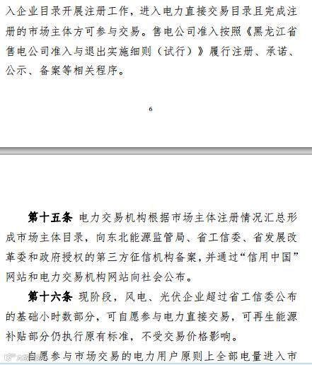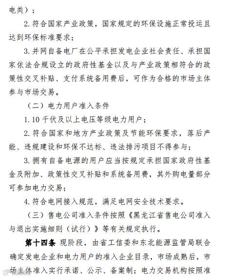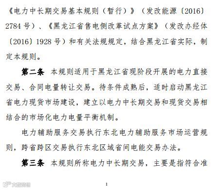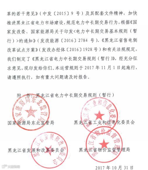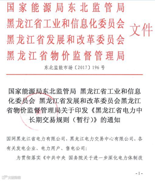 日前,国家能源局东北监管局、黑龙江省工业和信息化委员会、黑龙江省发展和改革委员会和黑龙江省物价监督管理局联合发布《黑龙江省电力中长期交易规则》(暂行)的通知,待条件成熟后,适时启动黑龙江电力现货市场建设,建立以电力中长期交易和现货交易相结合的 市场化电力电量平衡机制。原文如下: