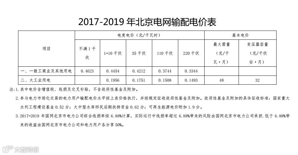 北京市发改委日前发布了《关于降低本市一般工商业电价等有关事项的通知》,2018年4月1日起,本市郊区(含北京经济技术开发区)非居民销售电价中一般工商业用户的电度电价每千瓦时下调1.53分; 2017-2019年北京电网输配电价中一般工商业及其他用户的电度电价每千瓦时下调0.51分。详情如下: