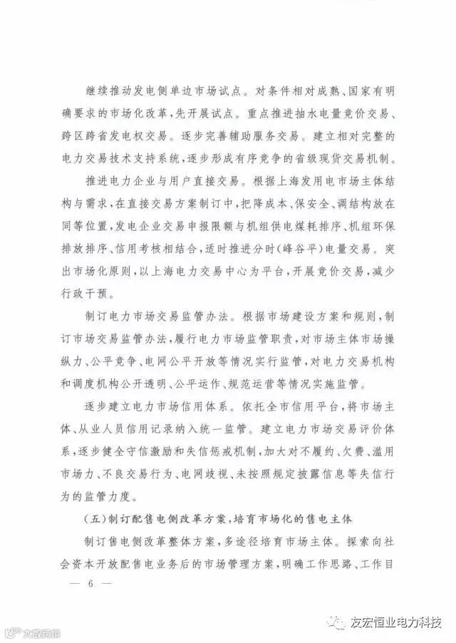 上海市人民政府日前下发了《上海市电力体制改革工作方案》,方案中称,上海电力体制改革要把特大型城市供电安全放在首位,坚持电力的统一调度,在市场体系与市场模式比选、市场品种与交易规则设计等各个环节,把有利于提升上海发供电安全放在最重要的位置。按照“管住中间、放开两头”的工作要求,以有序放开发用电计划为手段,释放市场空间。除政府保留公益性调节性发用电计划之外,其余电量逐步进市场。