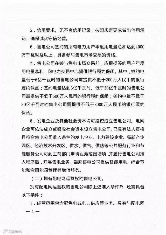 一起来看看通知中有哪些亮点:准入条件中要求,售电公司签约的所有电力用户年度用电量总和达到4000万千瓦时及以上,具备参与售电市场交易的资格。那就说明了,你的电量太少的话,是不能参加游戏的哦,也在一定程度上杜绝售电公司“养小鬼”的情况发生。另外也规定了售电公司缴纳保证金的事宜,签约电量低于6亿的售电公司需要提供200万人民币银行履约保函,6到30亿电量的需提供500万银行保函,30亿电量的需提供2000万银行保函。电力用户准入方面,大用户定义为上年年度用电量在4000万千瓦时且电压等级在35千伏及以上。需要全电量交易。交易方式采取双边协商、集中竞价、挂牌等方式,偏差考核为3%以内。