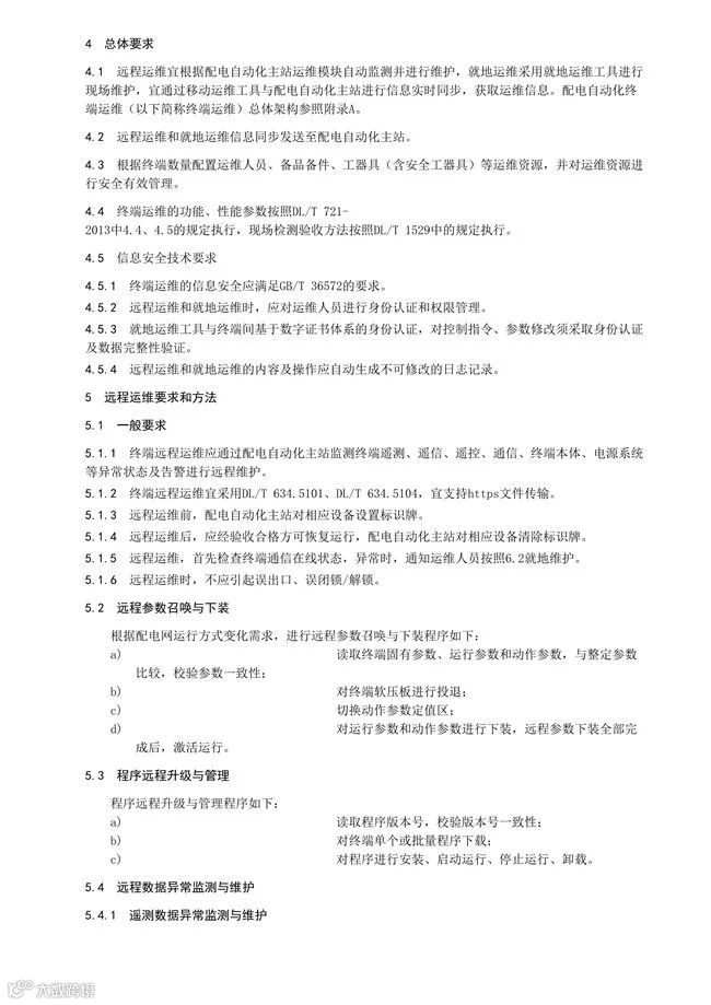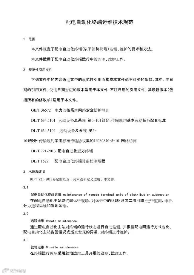 但是,配电自动化终端运维缺乏统一的体系架构、统一通信规约支撑、统一维护手段,缺乏标准化统一配置工具,为了使配电自动化终端运维标准化、规范化,有必要从监测、维护的技术要求和方法等方面对终端运维进行系统地规范。故编制《配电自动化终端运维技术规范》,以推动配电自动化终端运维的标准化。