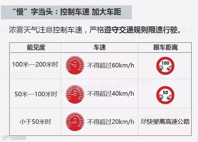 雾天行车最忌讳的就是快,因为视线不佳,过快的车速很可能会导致你在发现前方车辆时已经来不及作出反应了,从而引发交通事故。根据《中华人民共和国道路交通安全法实施条例》第八十一条规定:机动车在高速公路上行驶,遇有雾、雨、雪、沙尘、冰雹等低能见度气象条件时,应当遵守下列规定——