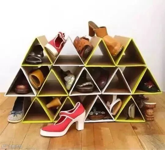 将快递盒折成三角形后黏在一起,美观又实用的鞋架就做好了。