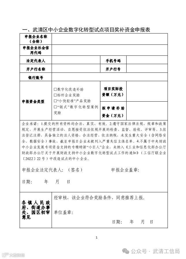 1.武清区中小企业数字化转型试点项目奖补资金申报表。