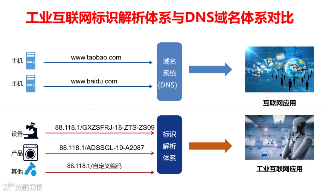 工业互联网标识解析是一种以万事万物的身份证为基础,以互联互通的接口为纽带,基于IPV6兼容IPV4的新一代网络基础设施,类似于互联网领域的域名解析系统(DNS),通过标识实现全球寻址,通过应用层和标识码,找到相关的信息,从而可以解决人访问物,物访问人,人访问人,物访问物,万事万物互联互通的问题。