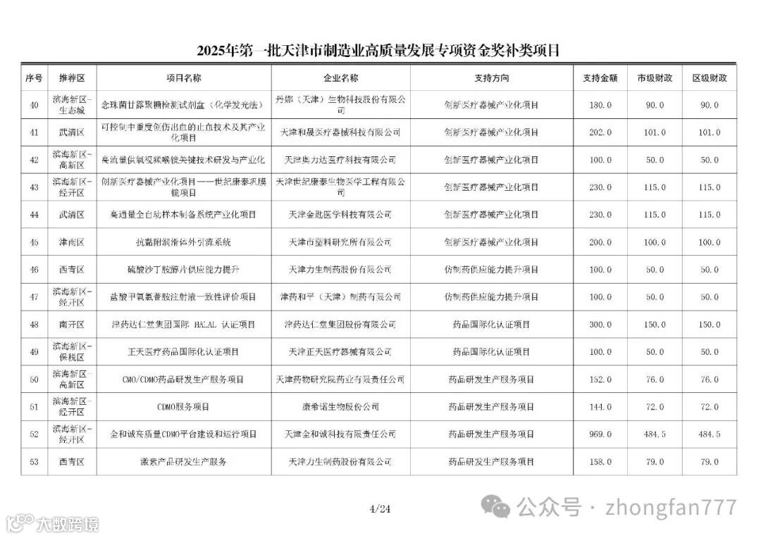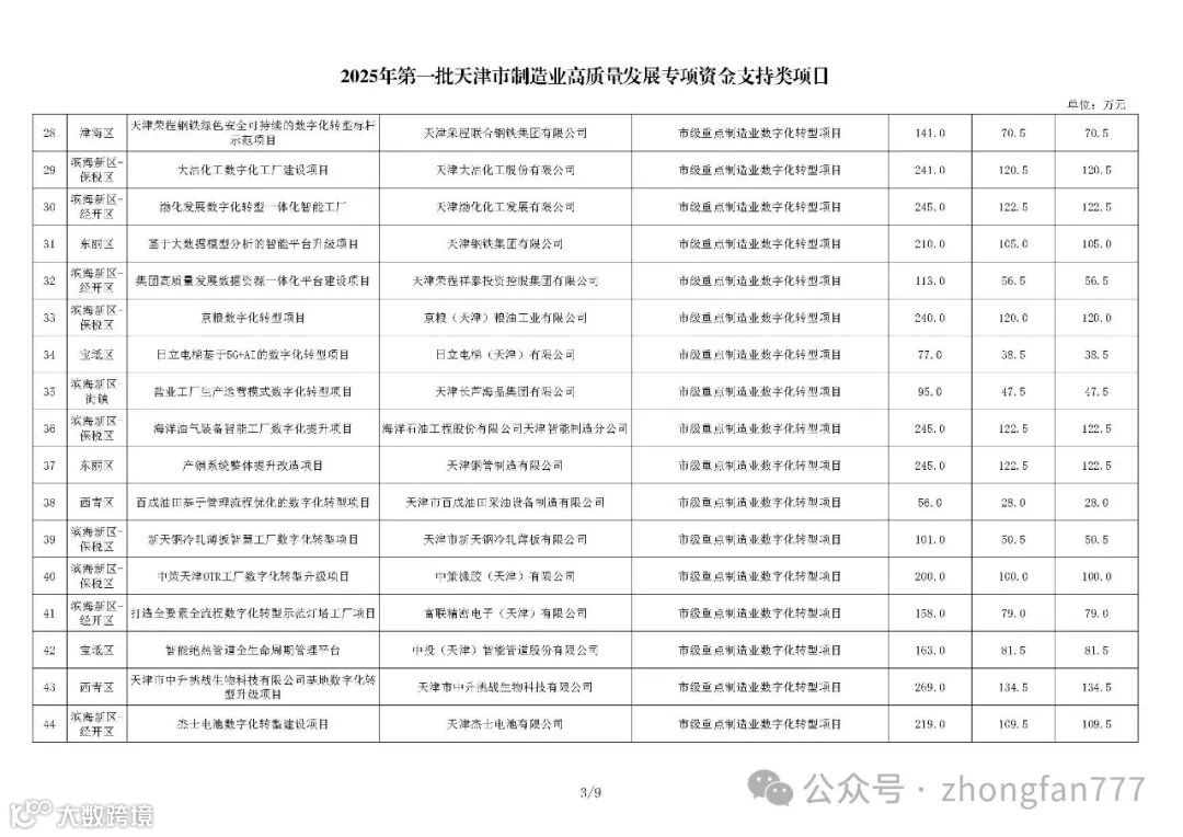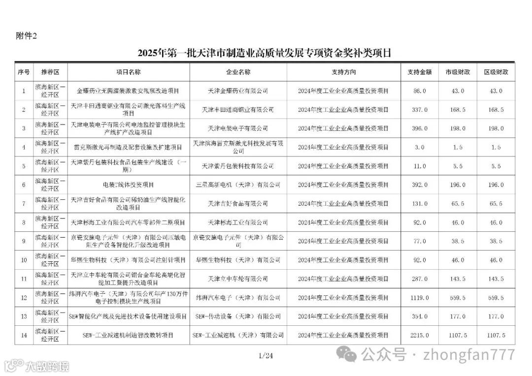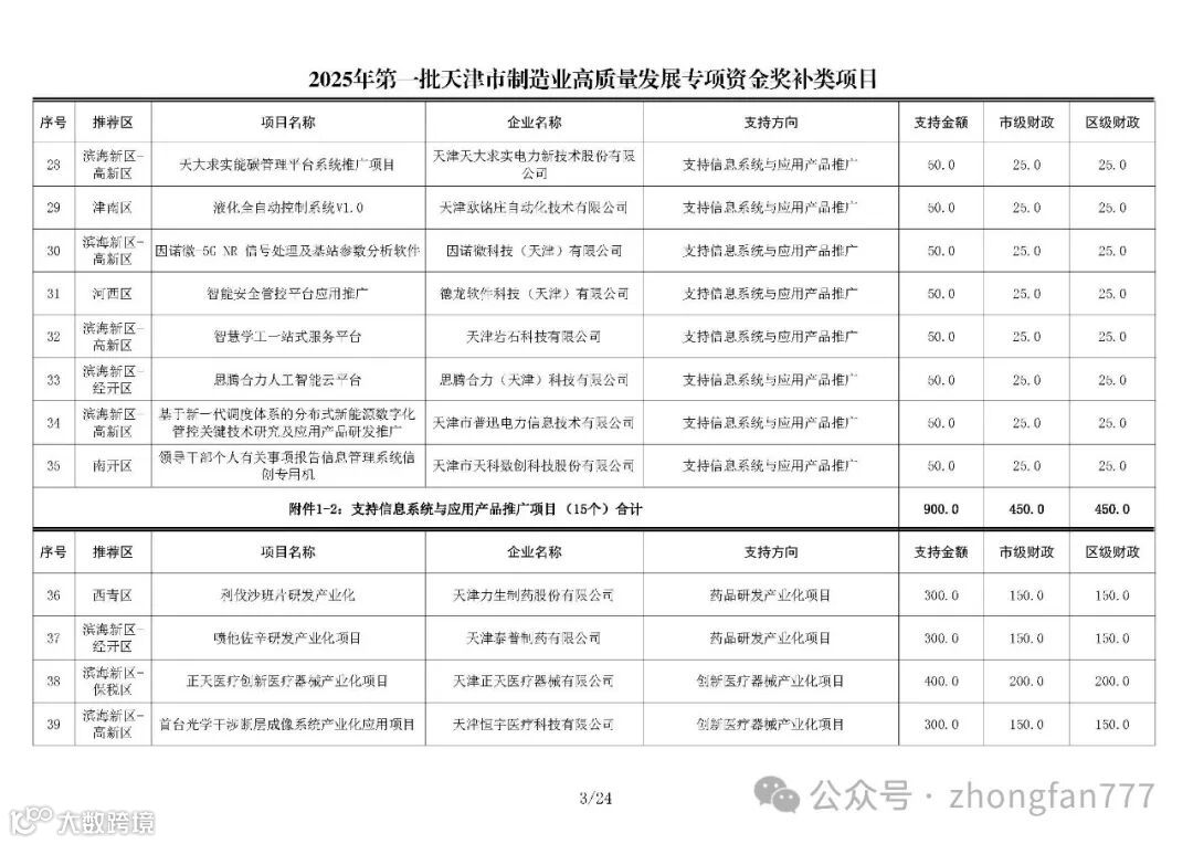 按照《市工业和信息化局市委网信办市发展改革委市科技局市财政局关于印发天津市制造业高质量发展专项资金和项目管理暂行办法的通知》(津工信规〔2024〕3号)相关规定,现将2025年第一批天津市制造业高质量发展专项资金项目(工信方向)予以公示,公示期七天。