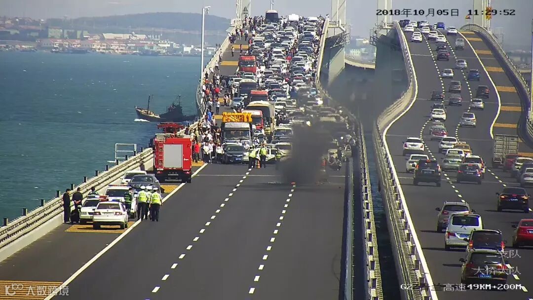 2018年10月5日11时,胶州湾跨海大桥济南方向50公里处发生一起追尾事故,发生事故后,当事人在等待交警处理过程中其中一辆小型轿车因发动机过热导致车辆自燃。事故未造成人员伤亡。