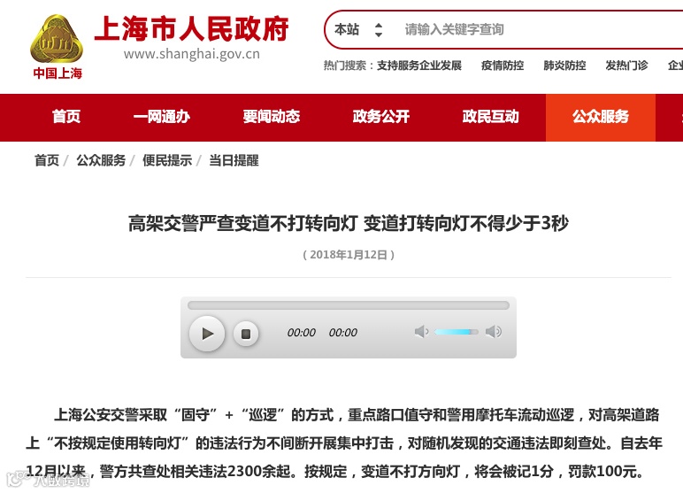 早在2018年12月,上海交警就对高架道路上“不按规定使用转向灯”的违法行为进行集中打击,一个月时间就查处2300余起违章,全部记1分,罚款100元。