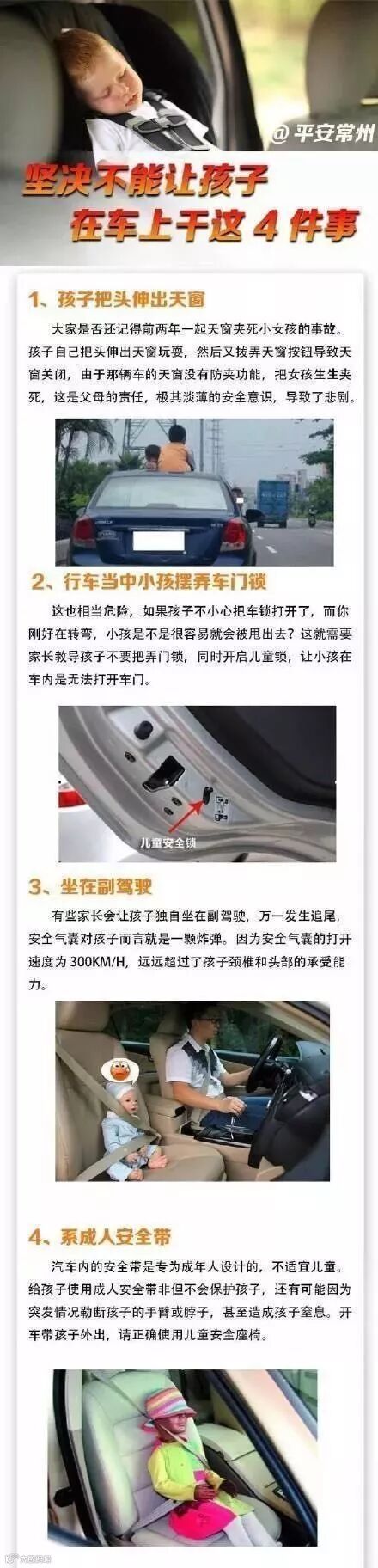 【坚决不能让孩子在车上干这4件事】孩子天性好动,带他们乘车是很多家长头疼的一件事,加上孩子自我保护意识差,安全意识也不是很强,这就要求家长们必须拿出加倍的责任心。[围观]一方面要看管好孩子,另一方面要告诉孩子在车上不能做哪些危险的事。详见大图