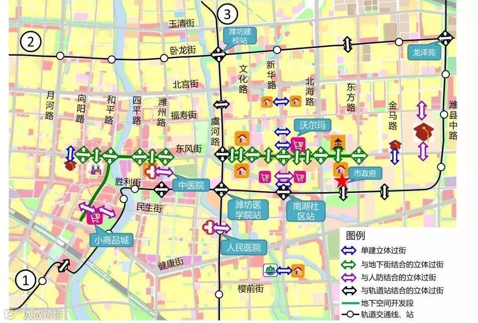 据统计,目前,潍坊市现状立体过街设施主要分布在老城区,共13处。立体过街设施总体较少,全部为地下过街通道,主要与地下街合建;总体使用情况欠佳,部分过街设施已经关闭。