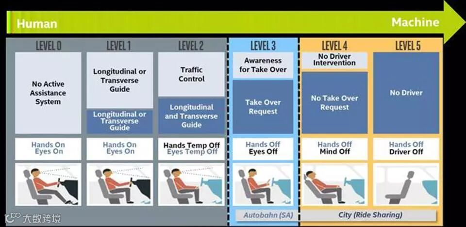 上图很直观的显示出了每个级别中人所能干的事儿,从最上面的绿色箭头可以看出,总体趋势是由人作为主体向车作为主体进化。
